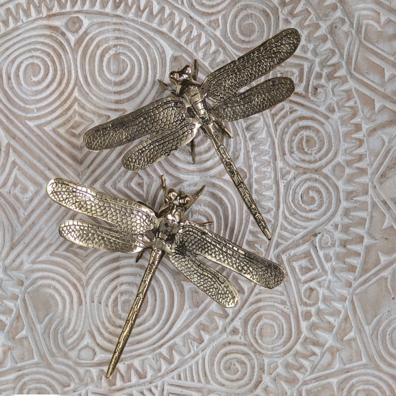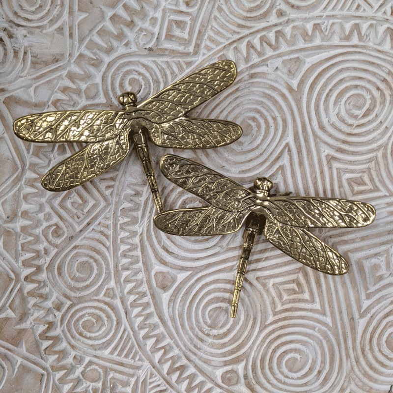 Polished gold brass dragonfly in 5 sizes. Elegant wall or tray decor piece with fine detail and natural charm. Handmade and versatile styling accent.
